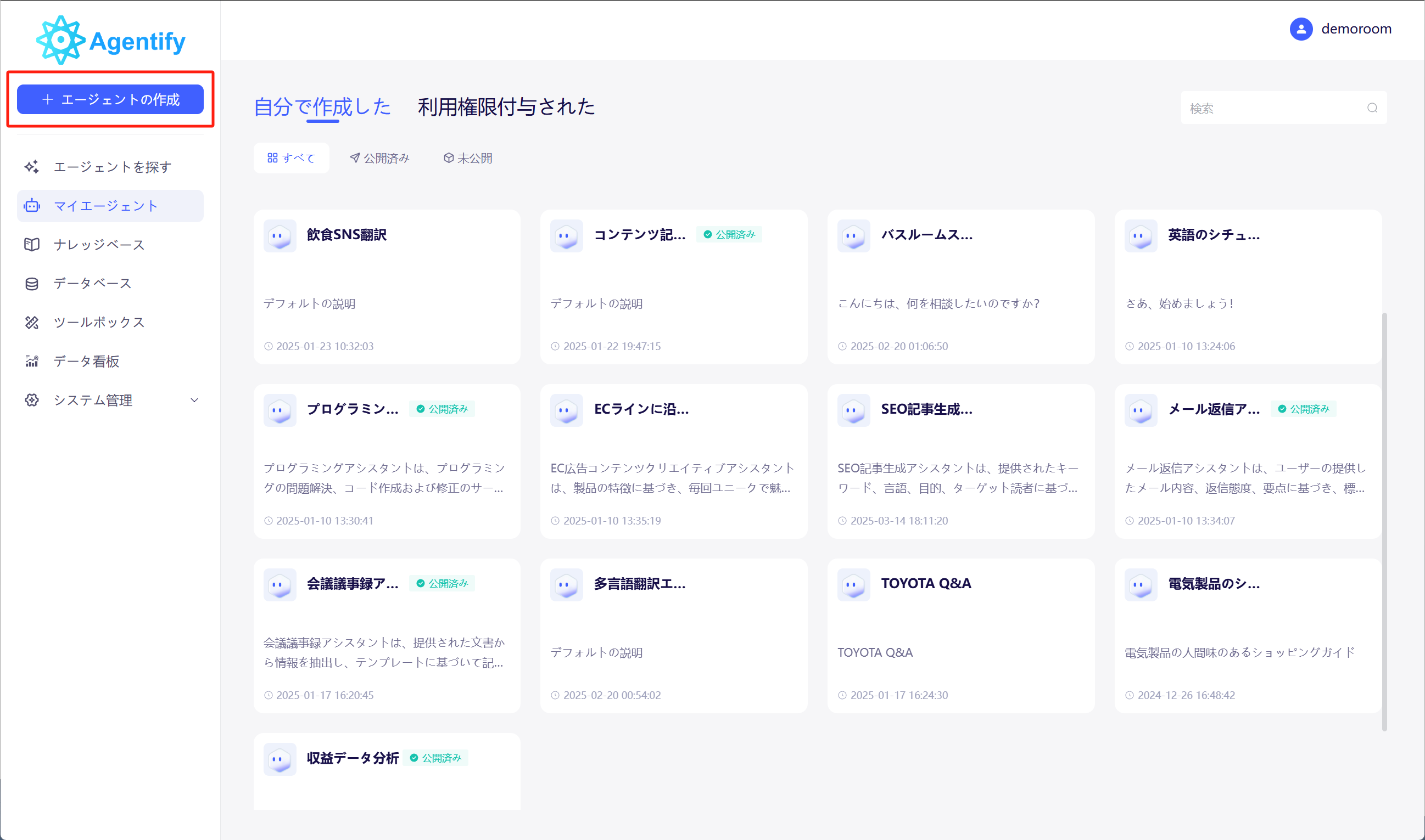- 「エージェントを作成」を選択し、作成プロセスを開始します。