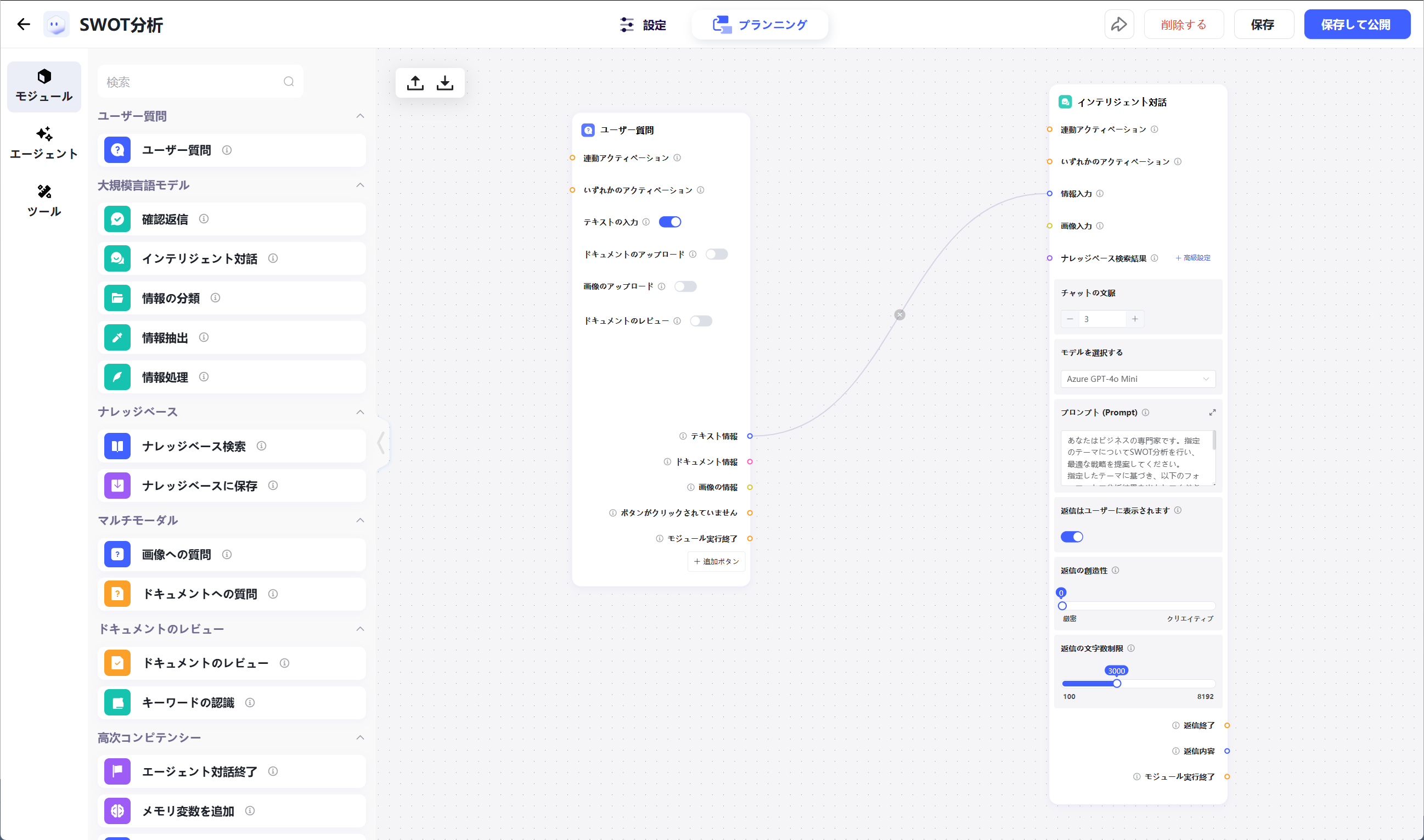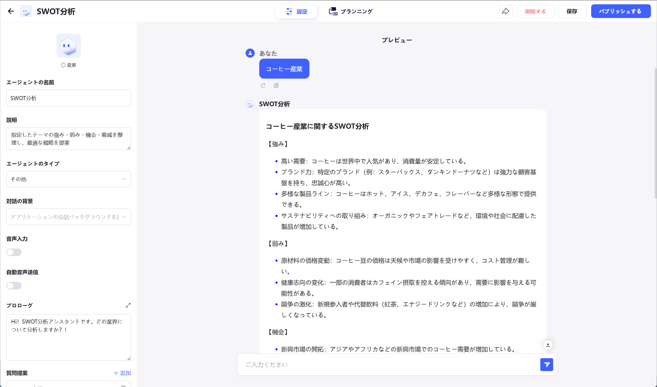 - エージェント名: エージェントの名前(例: SWOT分析)