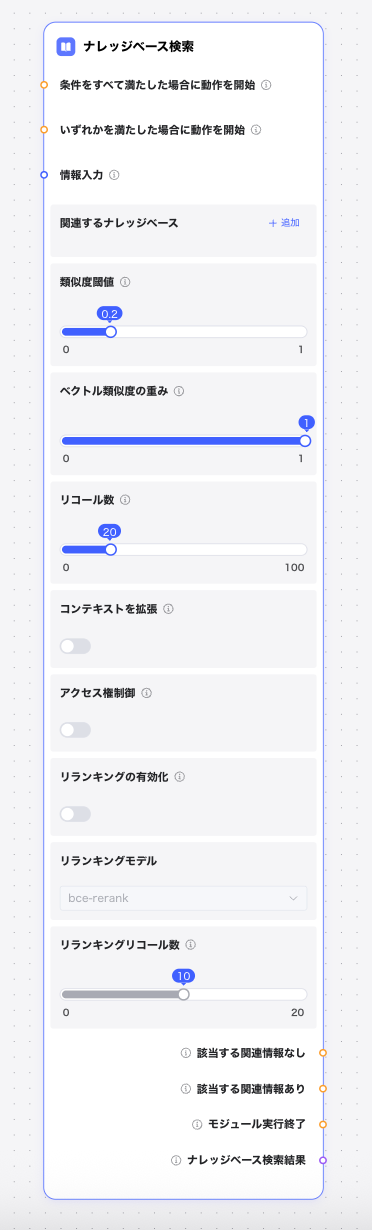 bce-rerank などの最適化モデルを選択可能です。リランキングリコール数