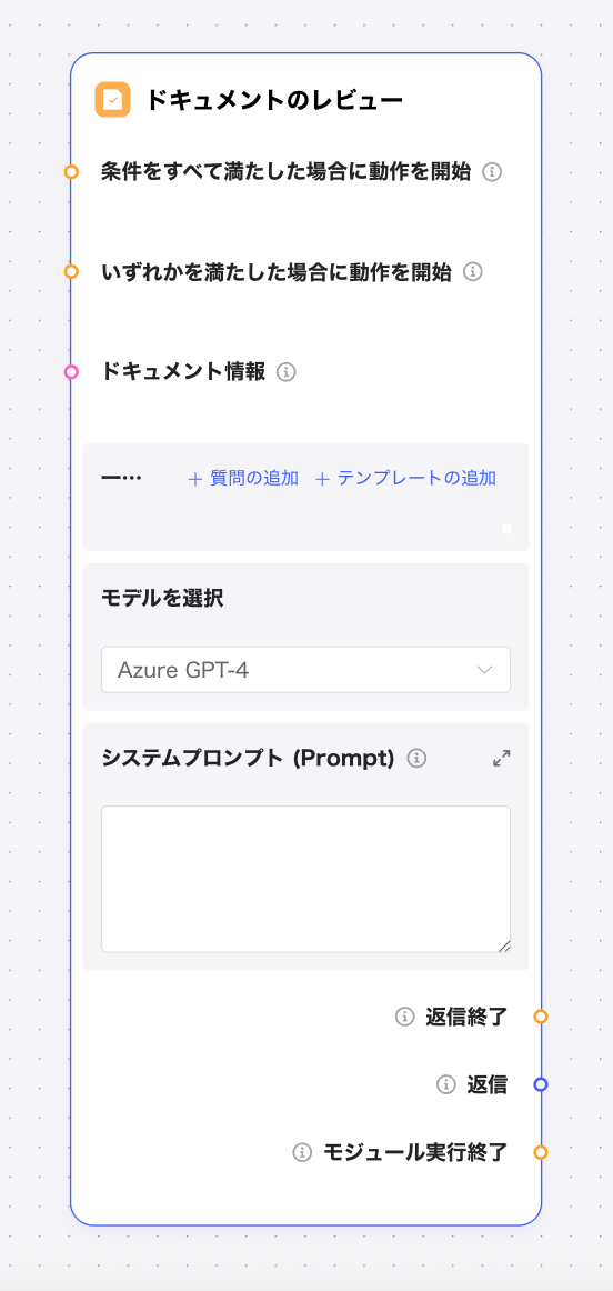 - ドキュメントの読み取りとレビューを行うモジュールです。ユーザーがドキュメントをアップロードすると、モデルが内容を解析し、あらかじめ設定された質問に従い順番に回答します。