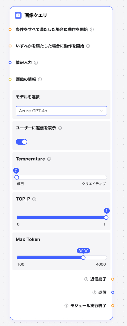 タイプ: 画像型「ユーザー入力」モジュールの「画像情報」から出力されたデータを受け取ります(PNG, JPG, JPEG, 最大30MB)。