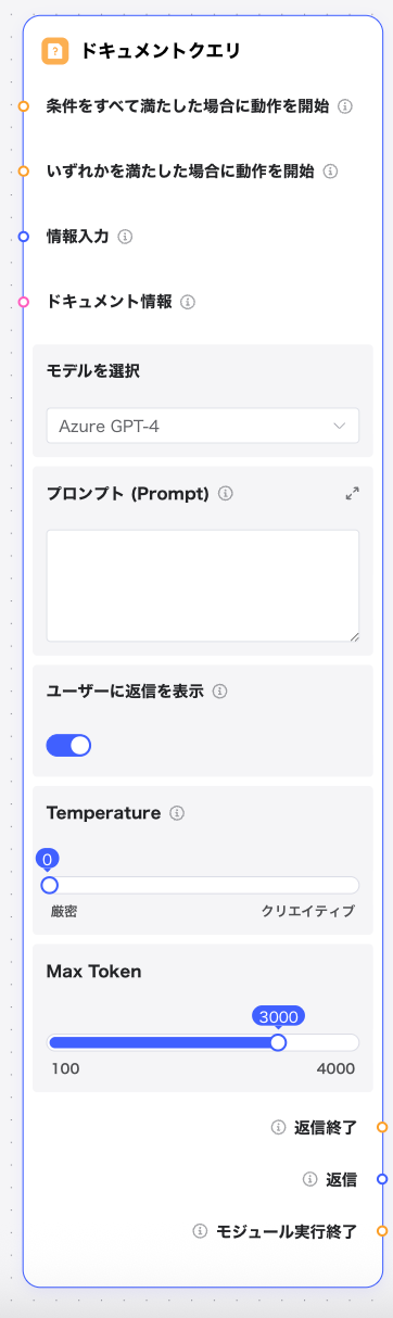 タイプ: ファイル型「ユーザー入力」モジュールの「ドキュメント情報」から出力されたデータを受け取ります(PDF, DOC, DOCX, TXT, 最大50MB)。