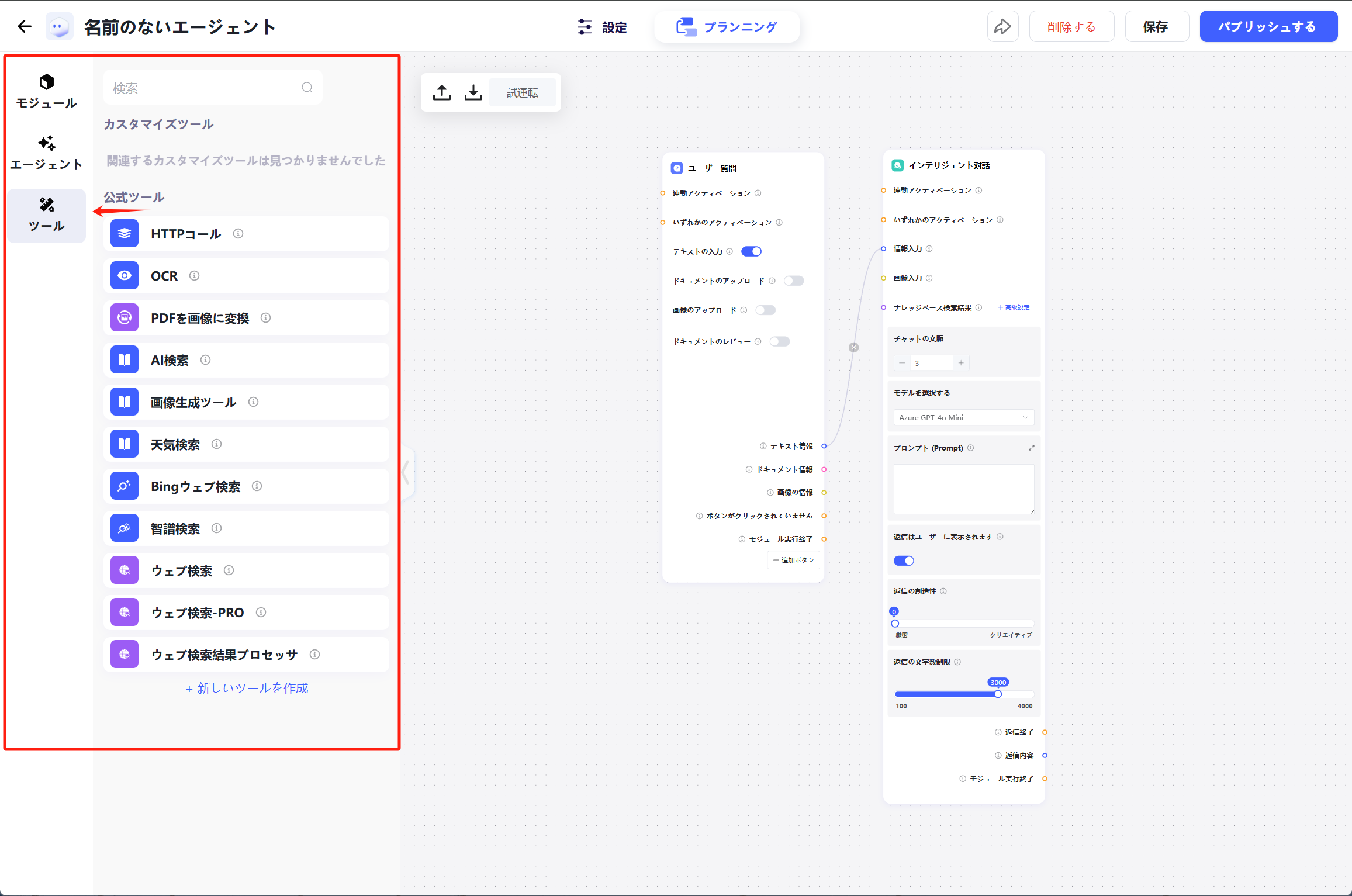 公開されたツールは、ワークフロー(フロー設計)画面でドラッグ&ドロップして使用可能になります。