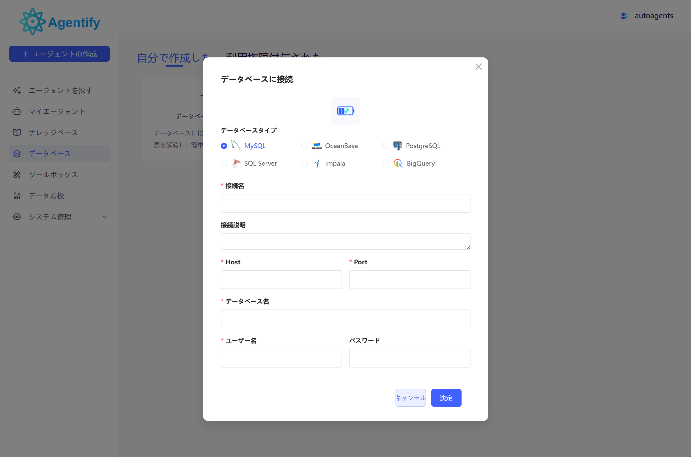現在、プラットフォームは以下の4種類のデータベース接続に対応しており、情報を入力するだけで簡単に接続を完了できます。