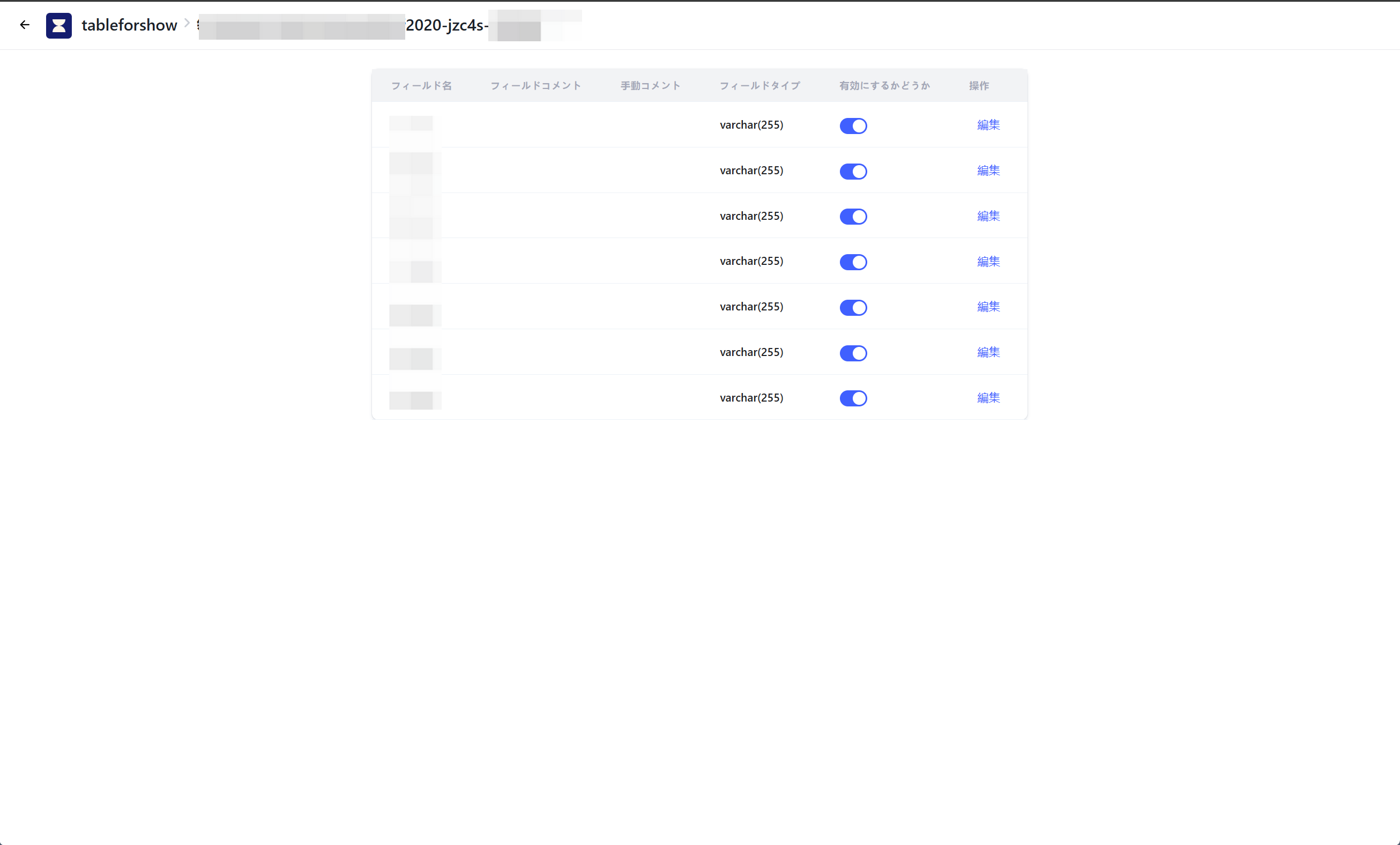 データテーブルを開くと、テーブル内のフィールド情報を管理できます。主な操作には、有効化/無効化の切り替えや手動での注釈追加などがあります。