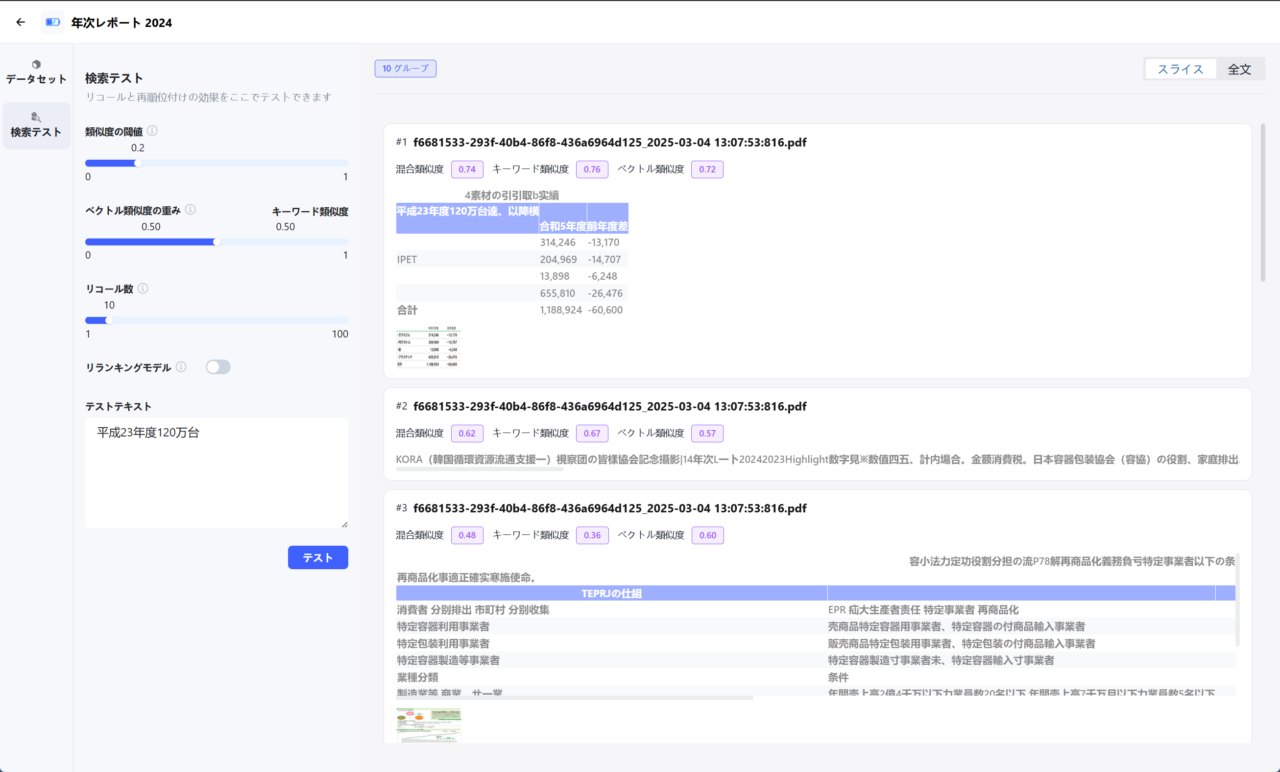 ファイル解析完了後、「検索テスト」ページでデータセットの検索精度を確認し、最適な設定に調整することができます。 実際にユーザーが入力しそうな質問を投げかけ、期待通りのドキュメントがヒットするかを確認しましょう。