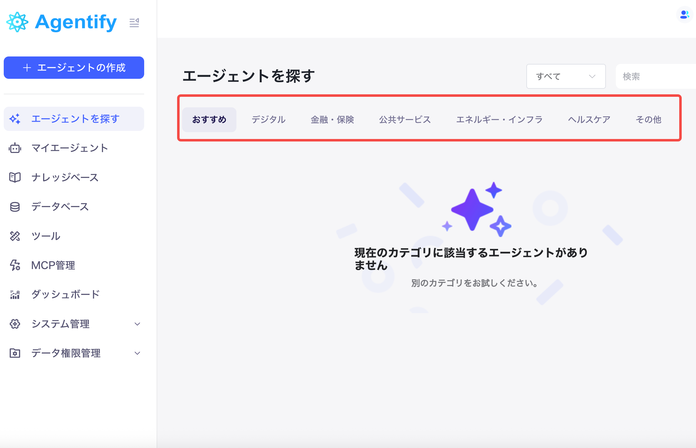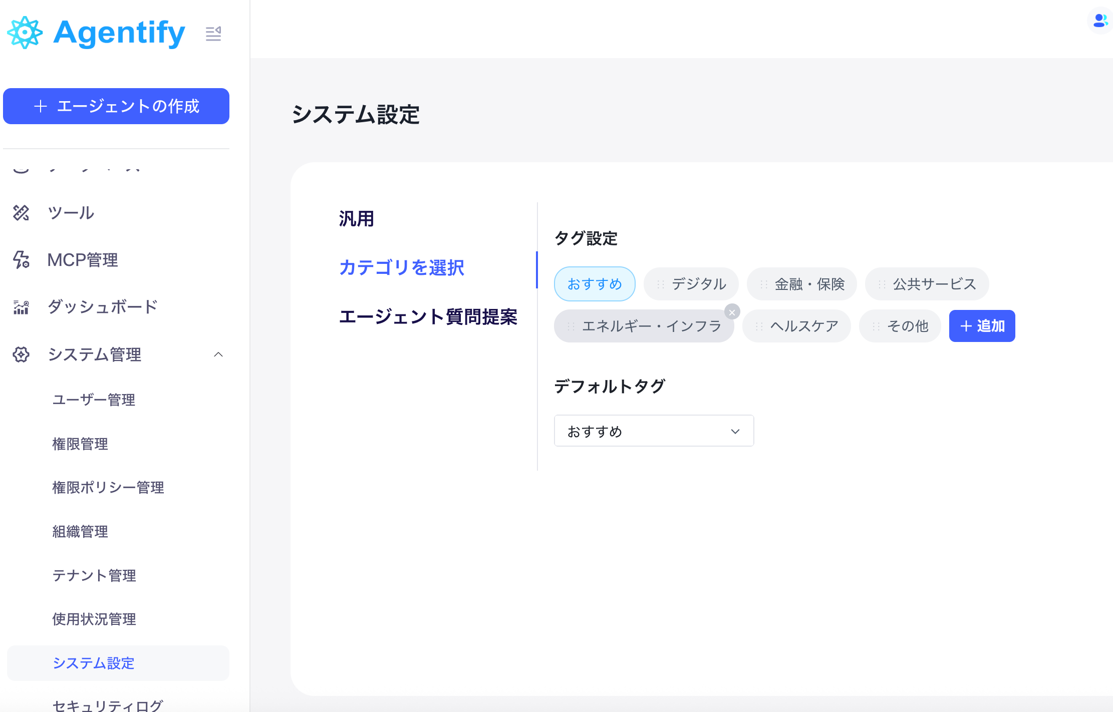 プラットフォーム内でエージェントを分類するための「カテゴリー」を自由に管理できます。
